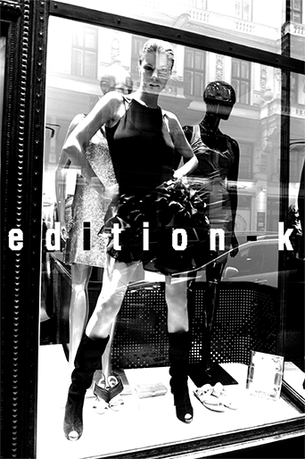 The wide range of the layouts for the catalogues, visit cards, the brand t-shirts and posters for the boutique «edition – K» which is situated in the mention Palais Equitable of in Vienna were made in the style of chick interiors and abstract mannequins.